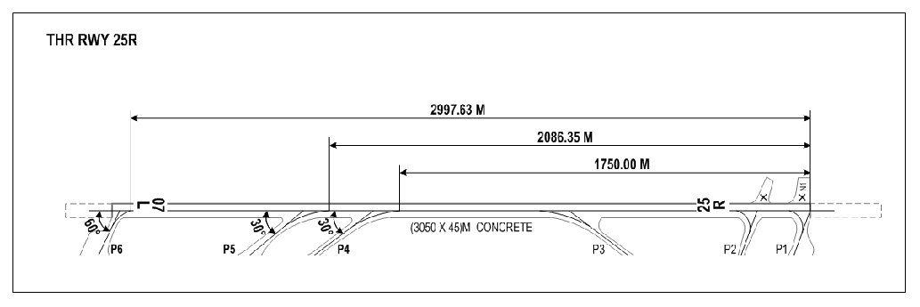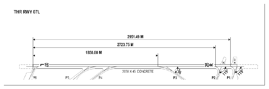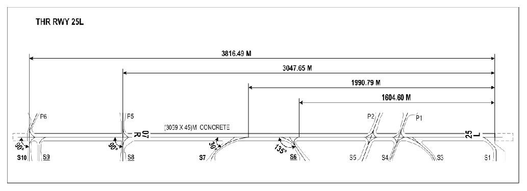 Đường lăn P1 (Một đoạn dài 75,6 M từ mép đường CHC 25R/07L), 44 M, Bê tông xi măng (lề đường lăn: bê tông nhựa), PCN 90/R/B/W/T Đường lăn P1 (Đoạn còn lại dài 280,4 M), 23 M, Bê tông xi măng (lề đường lăn: bê tông nhựa), PCN 61/R/B/X/T Đường lăn P2 (Phần chưa cải tạo, nâng cấp), 23 M, Bê tông xi măng (lề đường lăn: bê tông nhựa), PCN 85/R/B/W/T Đường lăn P2 (Phần đã cải tạo, nâng cấp), 38 M, Bê tông xi măng (lề đường lăn: bê tông nhựa), PCN 90/R/B/W/T Đường lăn P3, 23 M, Bê tông xi măng (lề đường lăn: bê tông nhựa), PCN 90/R/B/W/T Đường lăn P4, 23 M, Bê tông xi măng, PCN 90/R/B/W/T Đường lăn P5 (Một đoạn dài 378,42 M từ mép đường CHC 25R/07L), 29 M, Bê tông xi măng (lề đường lăn: bê tông nhựa), PCN 90/R/B/W/T Đường lăn P5 (Đoạn còn lại dài 76,3 M), 23 M, Bê tông xi măng (lề đường lăn: bê tông nhựa), PCN 61/R/B/X/T Đường lăn P6 (Một đoạn dài 53 M từ mép đường CHC 25R/07L), 29 M, Bê tông xi măng, PCN 90/R/B/W/T Đường lăn P6 (Đoạn còn lại dài 311.2 M), 23 M, Bê tông xi măng, PCN 61/R/B/X/T Đường lăn S (Đoạn từ TWY S1 đến TWY S5), 23 M, Bê tông xi măng, PCN 85/R/B/W/T Đường lăn S (Đoạn từ TWY S5 đến TWY S10), 23 M, Bê tông xi măng, PCN 90/R/B/W/T Đường lăn S1 (Đường lăn nối), 95 M, Bê tông xi măng, PCN 61/R/B/X/T |